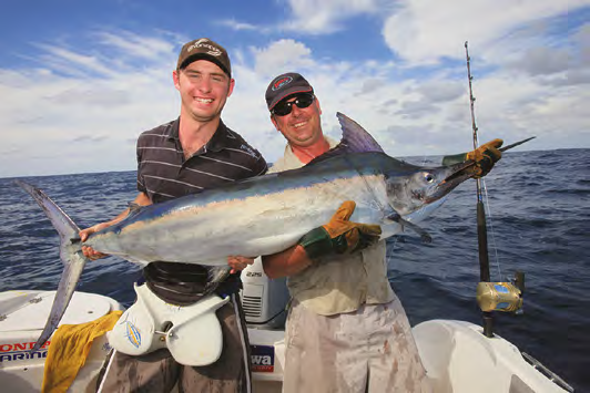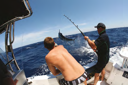 The blue marlin is the most elusive, rarely venturing inside the continental shelf. The striped marlin is much more cosmopolitan and while favouring waters along the continental shelf at times they will venture right into coastal waters. Finally, we have the black marlin which is the biggest and most prolifi c. They can be found anywhere from the coast to thousands of miles offshore. Better still, every season, juvenile blacks follow the currents south along both coasts and can even be caught from the shoreline.