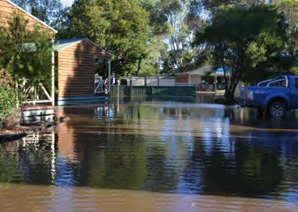 Once I had set myself up on my concrete island I decided I would look around. Donned the boots and set off towards the office at the other end of the ‘lake’. It only took a dozen or so steps for me to realise that the water was about to fill up my boots, much too deep for an excursion, so I returned to my trailer. My raised island, which I shared with a caravan and two motorhomes, was obviously the highest part of the park as the water flowed relentlessly around, up and over everything else. I rang the office and identified myself as being on ‘Gilligan’s Island’ to find out if the laundry had suffered the same fate as the roads and paths, and the manager offered to pick me up in his ute and deliver me to the laundry block (fortunately elevated) for me to look after my laundry. He also returned me to my ‘home’ by the same method and was my ‘pilot’ when I departed, as it was impossible to distinguish the roads. I had hoped to use the dump point, but that was under a foot of water and just to make things worse (if that was possible!) a tree with shallow roots had fallen over one of the access roads blocking an exit. On later enquiry I discovered that the telephone and EFTPOS was out for eight days, the park refused bookings for at least four days and the water took at least five days to disperse to allow the clean up to go ahead, but the manager, his wife, and their staff never lost their happy smiles and their pleasant manner.