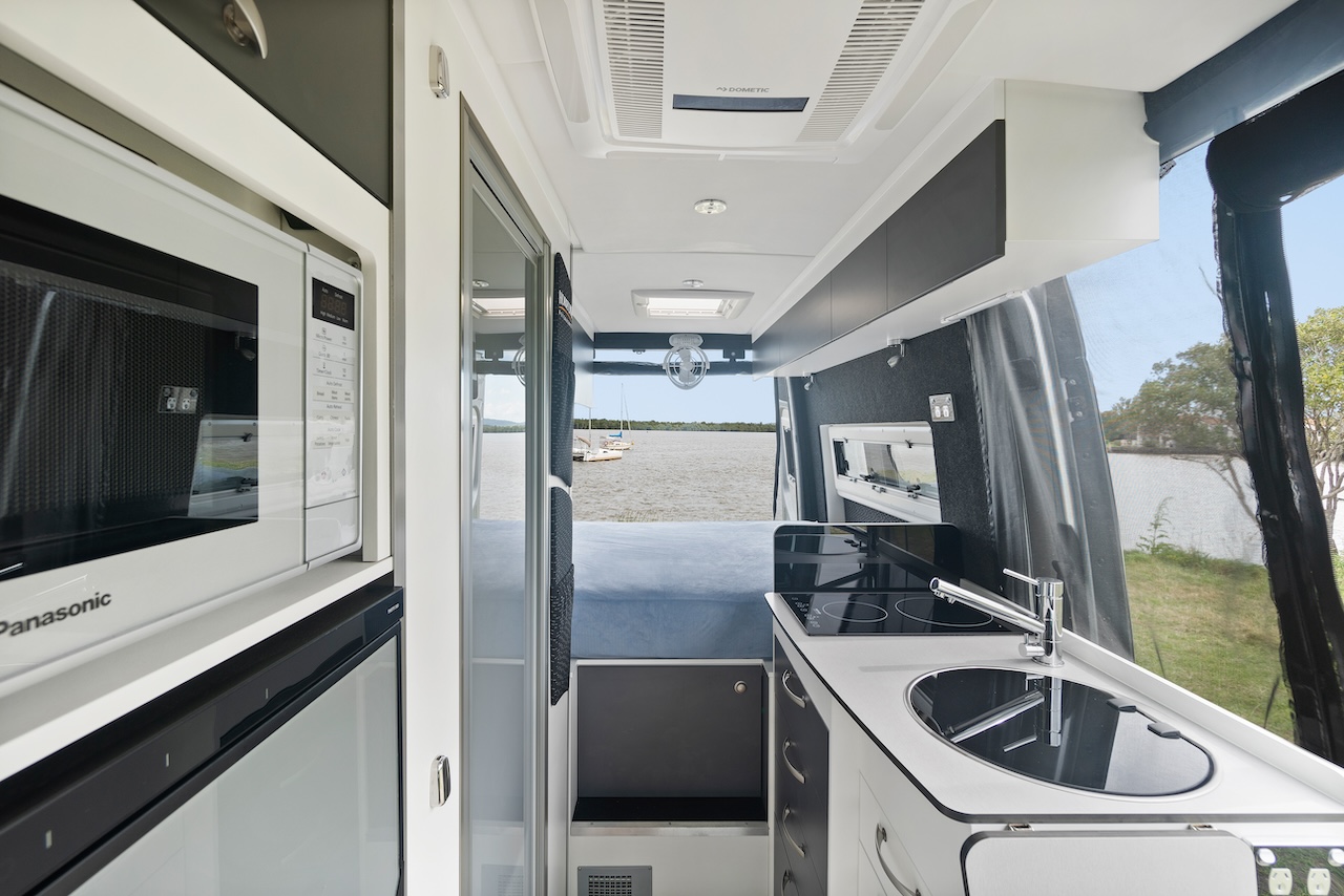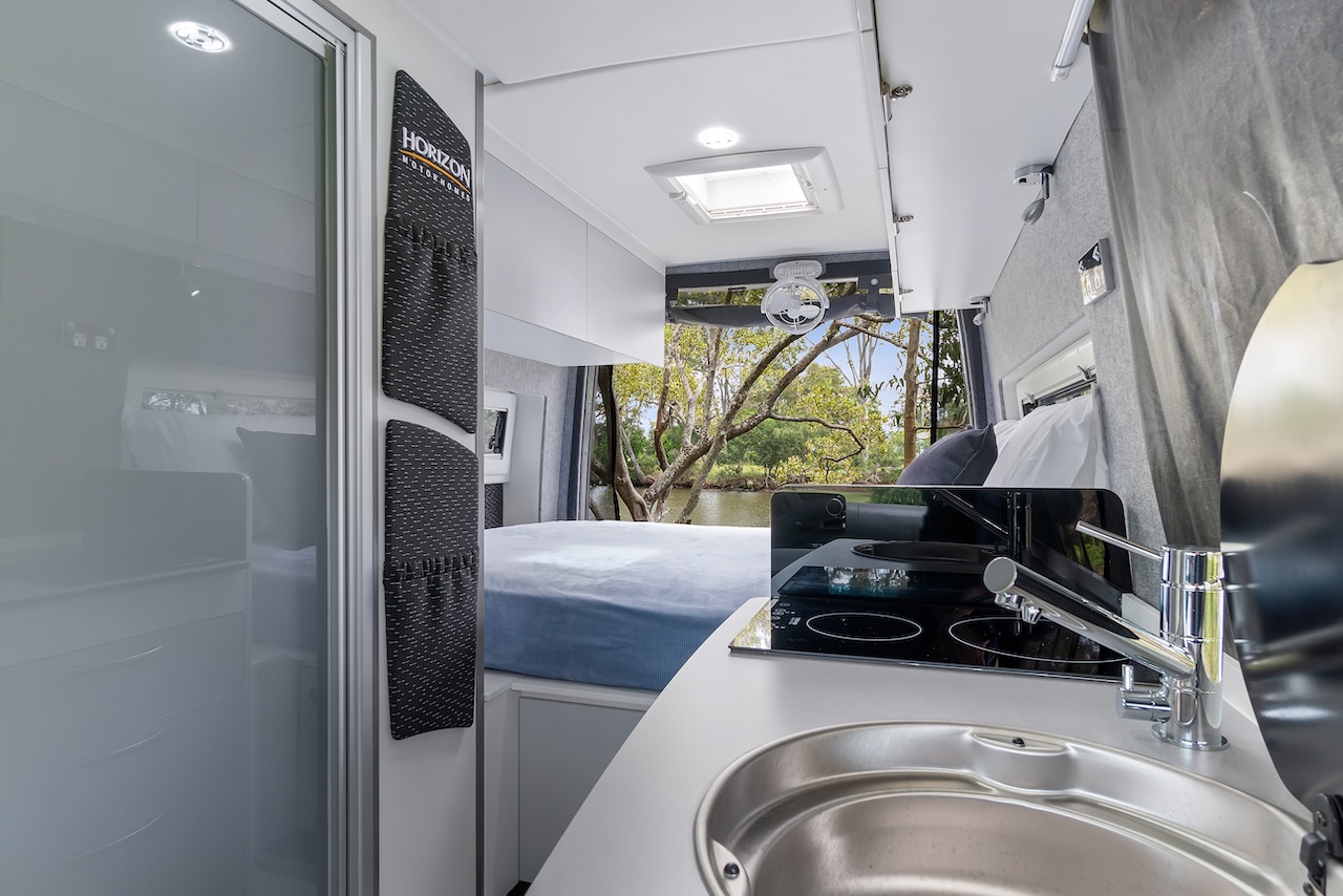 The kitchen bench area might be quite small, but there’s enough room for a generous drawer space. The bench-top fit-out includes a Thetford induction cooktop and a round stainless steel sink. The benchtop space isn’t great, but there is a hinged bench extension.