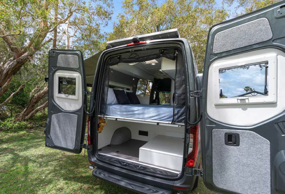 However, the window pods on both sides at the rear are a little different. Looking a bit like bay windows, they allow for a longer than usual east-west bed inside. The pods are asymmetrical though (the offside pod being wider than the nearside), thus accommodating the sliding door. The pod windows are a simple innovation that has an efficient outcome.