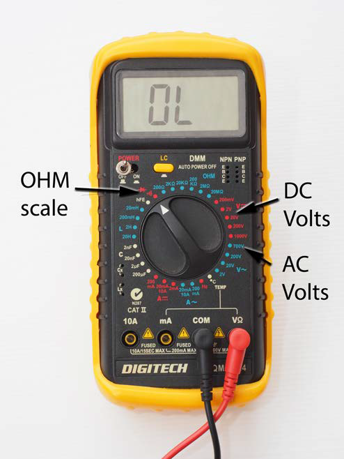 Some digital multimeters can be quite confusing to the uninitiated. But for our purposes, the requirements are pretty simple. A multimeter should at least have an ohm (represented by the O symbol) scale, an AC voltage scale (represented by a V with a squiggly line) and a DC voltage scale (represented by a V with a straight or dashed line). An alternative to the DC scale can be a battery tester with voltage settings like 1.5V, 6V, 9V and 12V. Sometimes the ohm scale also has a diode symbol (sideways cross with a superimposed triangle) or a buzzer symbol.