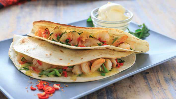 Fold the tortilla in half over the top of the prawns and cheese; the tortilla should be a semi-circle in shape. Carefully place the once-folded wrap onto the oiled foillined baking tray. Brush the upper surface of the wrap with the remaining cooking oil.
