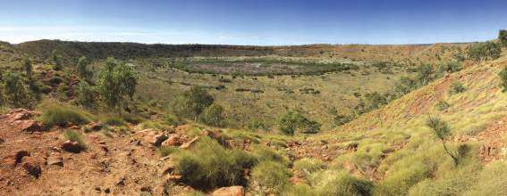 Accessible by a gravel road from Halls Creek in the dry season from May to October (4WD recommended but not essential) or towards the top end of the Tanami Road from Alice Springs, a visit here for us recently was quite a fascinating, even eerie, experience. As the shadows of the rim progressively work their way across the 750-metre crater floor in the late afternoon, the whole scene seems to take on a dark, empty feeling. At night, the crater, with its broad deep hole in the middle, is like looking into a giant black pit. Its mood changes once more at first light in the morning and once the sun reaches the crater floor, there is almost immediately an impression that life is springing back into this lonely outback formation.