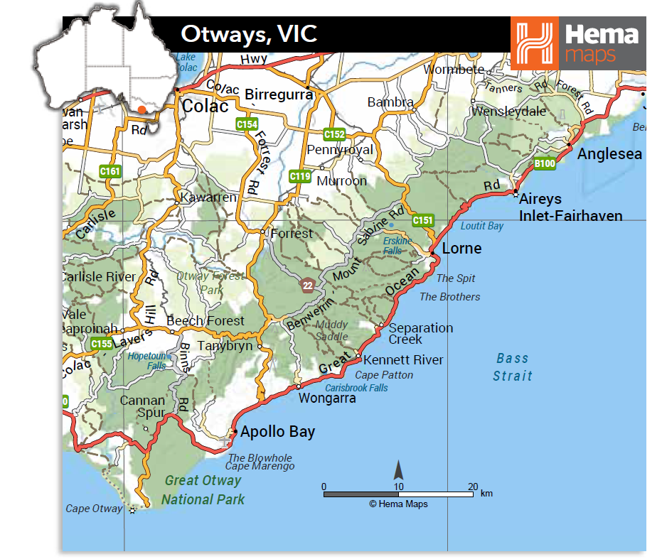 • Accommodation in cabins, motels or caravan parks and camping grounds is available at or nearby Anglesea, Aireys Inlet, Lorne, Wye River, Kennett River, Skenes Creek, Apollo Bay, Marengo, Lavers Hill, Forrest, Gellibrand and Colac.