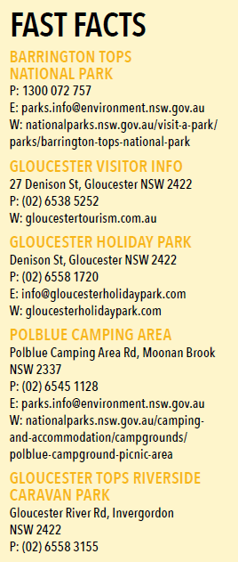 The only caravan park on the way there is the neat and tidy Gloucester Tops Riverside Caravan Park, but you’ll find a folksy atmosphere, friendly staff, toilets, a laundry, powered sites, permission to build a campfire, and swimming in the adjacent Gloucester River. Not too many would haul a caravan all the way up the mountain to Gloucester Tops proper, so this makes an excellent staging point for day-tripping.