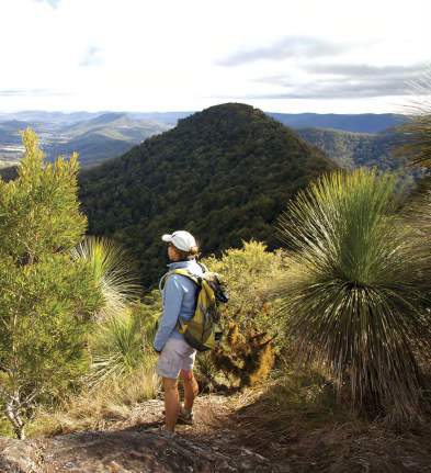 Eventually, gaps begin to appear through the foliage, affording views over the Scenic Rim mountains. After two hours’ of hiking up and around the double-humped Mount Mitchell, we inch towards the summit of the mountain’s East Peak. A savage wind whips across a knife-edge ridge that halts suddenly above a sheer cliff leading down into the Fassifern Valley. Nearby is Spicers Gap, so named by explorer and botanist, Allan Cunningham, when he passed through here almost 200 years ago, opening up a route to the fertile Darling Downs. And across the valley are Mounts Maroon, Lindesay, Barney and Ballow — all remnants from a time when volcanic activity shaped this region. Right now, I couldn’t imagine a more different time.