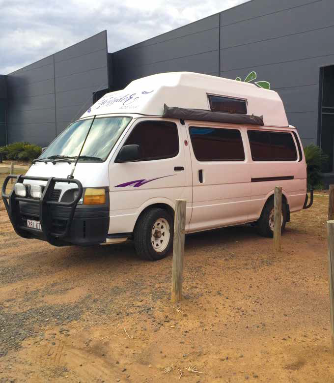 I was working in hospitality for mine sites in Queensland when I bought my Toyota HiAce camper from Apollo Motorhomes in Brisbane. She’s a 2003 ex-backpacker van named Violet.